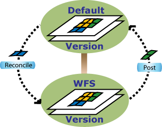 To keep the two versions in sync, a process can be run regularly to update the WFS version with edits from the Default version, and also to update the Default version with the edits from the WFS version. This is a two step process in the editing workflow of any versioned system called reconcile and post. This process can be automated or it can be administered by an editor (depending on their permissions) or database administrator. To learn more about the reconcile and post process see An Overview of the version editing process