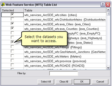 A WFS geodata service allows you to access a geodatabase through the internet or any OGC compliant WFS client. A geodata service may be created for any type of geodatabase including ArcSDE geodatabases, personal geodatabases and file geodatabases. When creating a WFS service from a geodata service, it is important to keep in mind that all of the feature classes in the geodatabase will be exposed in the service.