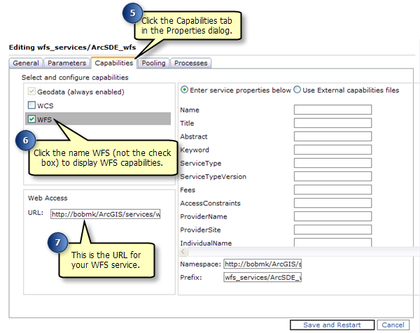 URL example: http://bobmk/arcgis/services/wfs_services/ArcSDE_wfs/GeoDataServer/WFSServer?request=getcapabilities