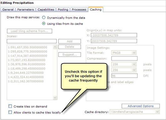 If you frequently update your cache, consider disabling the option for clients to cache tiles locally. This way, you know that those who use your cache will always see the most up-to-date tiles instead of older tiles that might be stored on their machines.