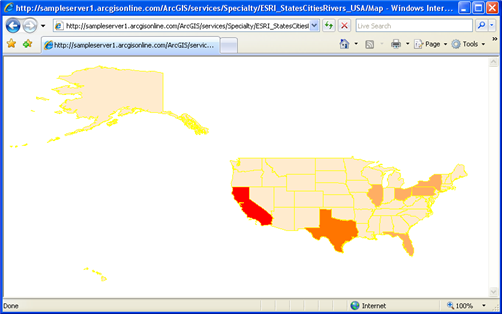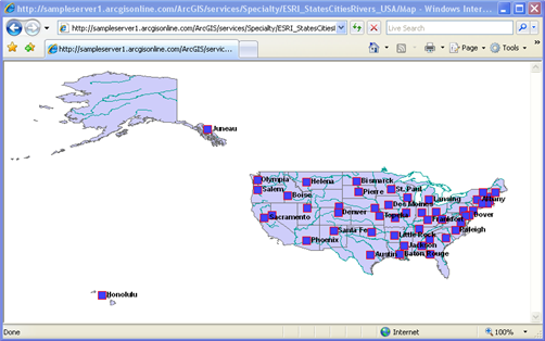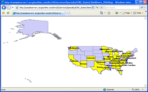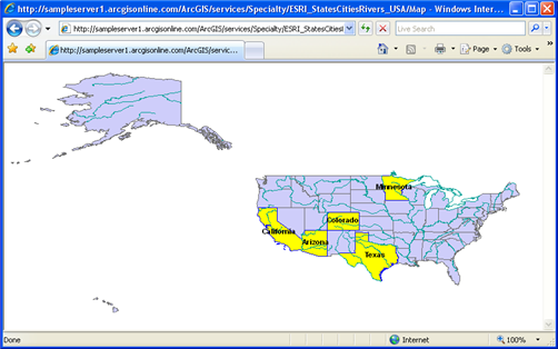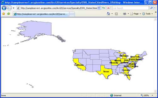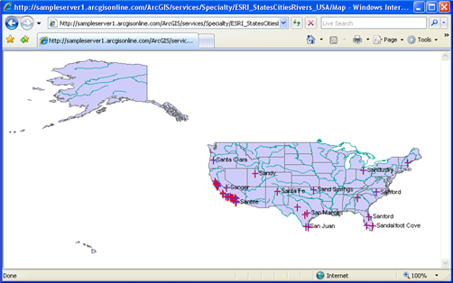 All SLD samples below are designed and created for a public ArcGIS Server WMS service called ESRI_StatesCitiesRivers_USA, which can be accessed through the URL http://sampleserver1.arcgisonline.com/ArcGIS/services/Specialty/ESRI_StatesCitiesRivers_USA/MapServer/WMSServer? To use the samples, you can either click the GetMap request link or copy the request string and open it in a browser.