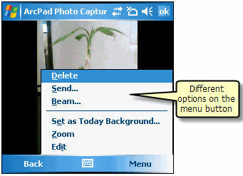 For photos associated with a feature, the photo filename will use the selected field name in the Picture page of the Feature Properties dialog box. The photo filename will also include a unique number, or if specified in the ArcPad Options, the date and time at which the photo was taken.