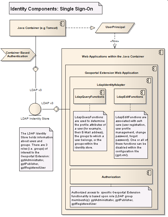 The Geoportal extension implements a standard Java container-based authentication pattern. The Java container is configured to authenticate against an identity store. Inbound requests are processed by the container and credentials are requested for and authenticated as required. Information about the authenticated user is then supplied, per request, to each participating web application running within the container. This information is supplied as a UserPrincipal object, which typically holds a "username" credential, the "password" credential is not provided to the underlying applications.